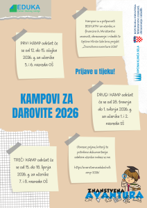 OTVORENE SU PRIJAVE za sva tri kampa. Kriteriji te potrebna dokumentacija odabira učenika nalaze se u PRAVILA I UVJETI SUDJELOVANJA U „ZNANSTVENOJ AVANTURI 2026“ https://znanstvena.eduka.hr/kamp-2026/